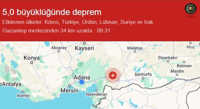 Afet ve Acil Durum Yönetimi Başkanlığının (AFAD) internet sitesinde yer alan bilgiye göre, saat 09.31’da merkez üssü Pazarcık olan 5 büyüklüğünde sarsıntı kaydedildi. Depremin 7 kilometre derinlikte meydana geldiği öğrenilirken deprem Gaziantep, Adana ve Osmaniye’de de hissedildi.